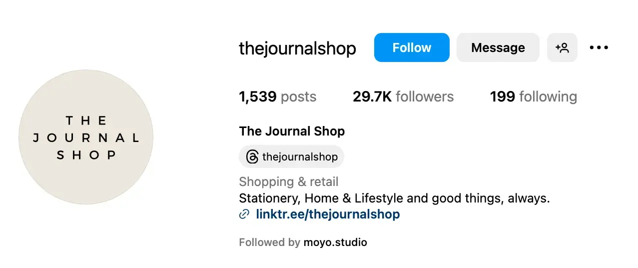 Your Instagram username (or handle) should be recognizable and easily searchable — like your business name. In the example below, the UK business The Journal Shop uses the intuitive handle @thejournalshop.