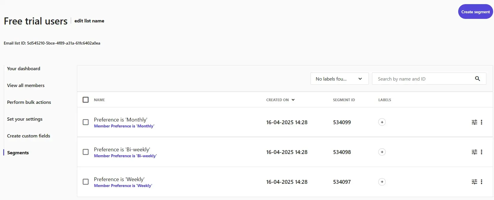 With an email tool like Moosend, you can create a preference center so subscribers set their own frequency. What you get is three segments (that update automatically as users change their preferences):