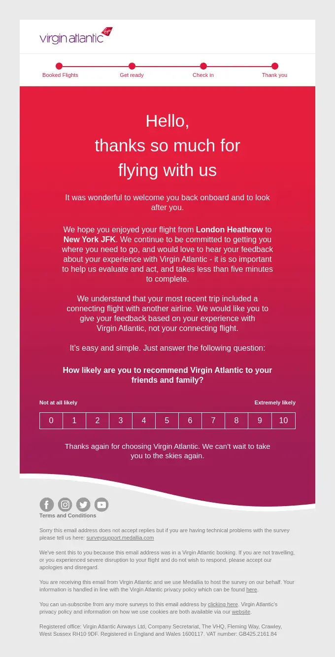 In this email, Virgin Atlantic starts with a heartwarming thank-you note. Moving on, they explain why they need this Net Promoter Score (NPS) survey and the time it takes.