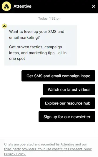 Attentive keeps things simple by offering links to valuable resources. For specific actions like getting a demo, the visitor has to fill in their email address.